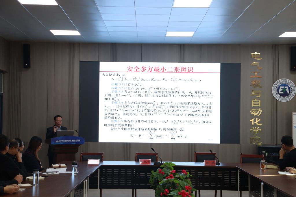 会上,张纪峰教授首先开展了题为《隐私保护下的分布式参数辨识与控制》的学术讲座。讲座中,张教授首先阐述了隐私保护的研究背景及现状,然后讲授了隐私保护的安全多方参数辨识方法,接下来论述了差分隐私分布式参数辨识方法,进而讲解了差分隐私分布式随机优化策略,最后分析了隐私遮盖下的分布式趋同。参会教师结合报告中关于隐私保护下的分布式参数辨识与控制技术存在的疑惑提出问题,与张教授进行了交流和探讨,张教授给予了一一详细解答。