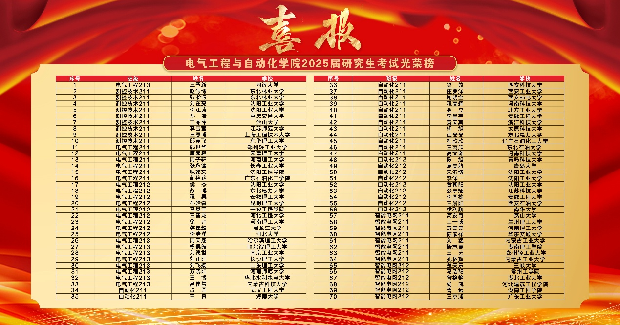 春风送捷报,桃李竞芬芳!在2025年全国硕士研究生招生考试中,电气工程与自动化学院学子凭借扎实的专业知识、顽强的拼搏精神和不懈地努力,在激烈的竞争中取得了令人瞩目的优异成绩。