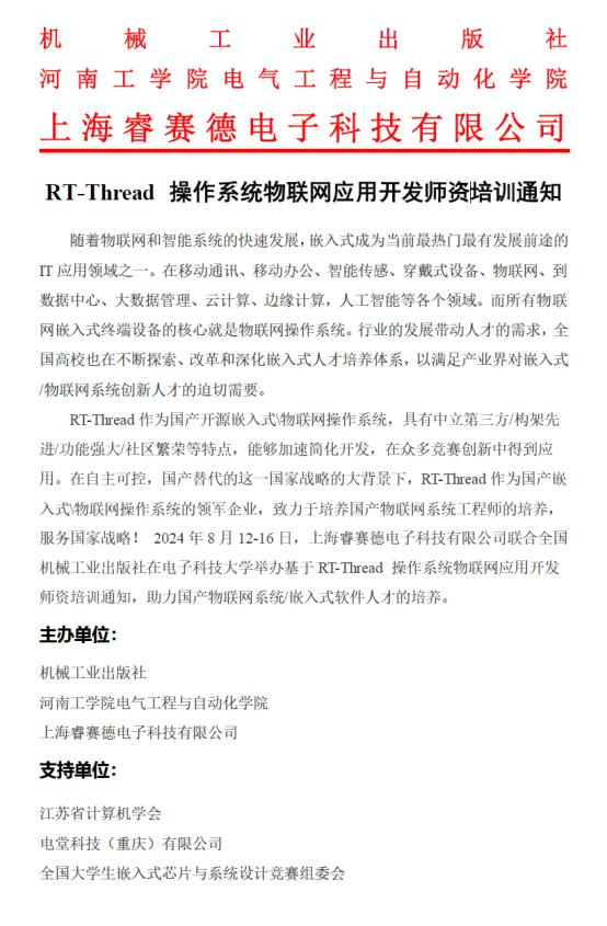 2024年8月12日-16日,“RT-Thread嵌入式操作系统物联网应用开发师资培训”在电子科技大学顺利进行,本次培训由河南工学院电气工程与自动化学院、机械工业出版社、上海睿赛德电子科技有限公司主办,受江苏省计算机学会、电堂科技(重庆)有限公司、全国大学生嵌入式芯片与系统设计竞赛组委会支持,来自全国12所高校的22名教师参加此次培训。