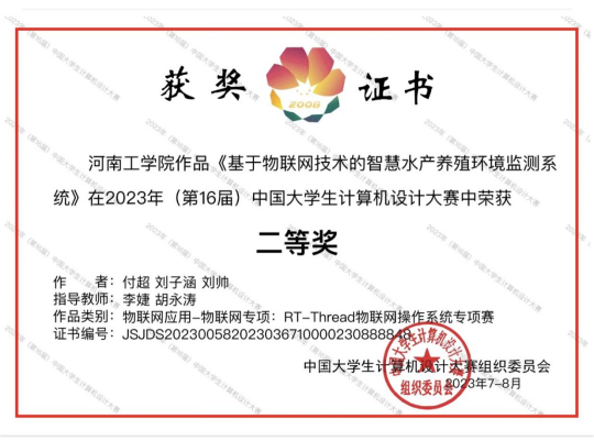 8月11日,2023年(第16届)中国大学生计算机设计大赛全国总决赛物联网应用—物联网专项结果揭晓,我院由李婕老师和胡永涛博士共同指导学生付超、刘子涵、刘帅3名同学的作品《基于物联网技术的智慧水产养殖环境监测系统》荣获全国二等奖。
