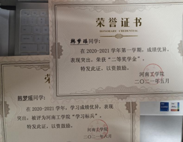韩梦瑶,电气学院20级测控技术与仪器201班学生,获得2020-2021学年校二等奖学金,2020-2021学年校学习标兵。