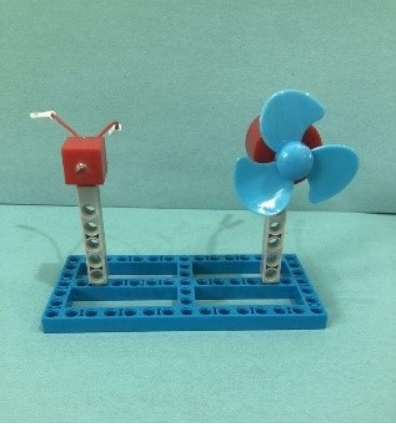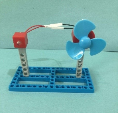 4.最后,把电机和二极管的两极用导线连接起来,用手转动扇叶或对着扇叶吹气,发光二极管会发光,随着扇叶旋转速度变快,发光二极管变得明亮又清晰。