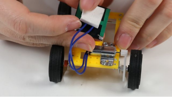 6.固定太阳能电池,可以用双面胶或者泡沫胶,粘贴牢固即可,小车安装完成了,放在阳光直射的地上就可以奔跑了。