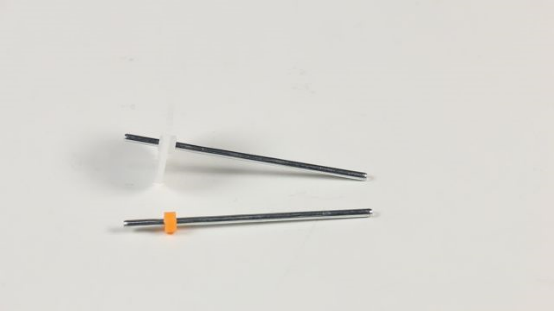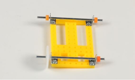 3.把安装好的铁轴穿过第一步安装的轴架的孔洞,然后用黄色的轴套固定;