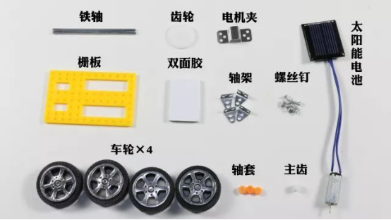 首先我们要准备铁轴、齿轮、电机夹、太阳能电池、栅板、双面胶、轴架、螺丝钉、车轮、轴套、主齿。材料准备好了,开始我们的实验吧!